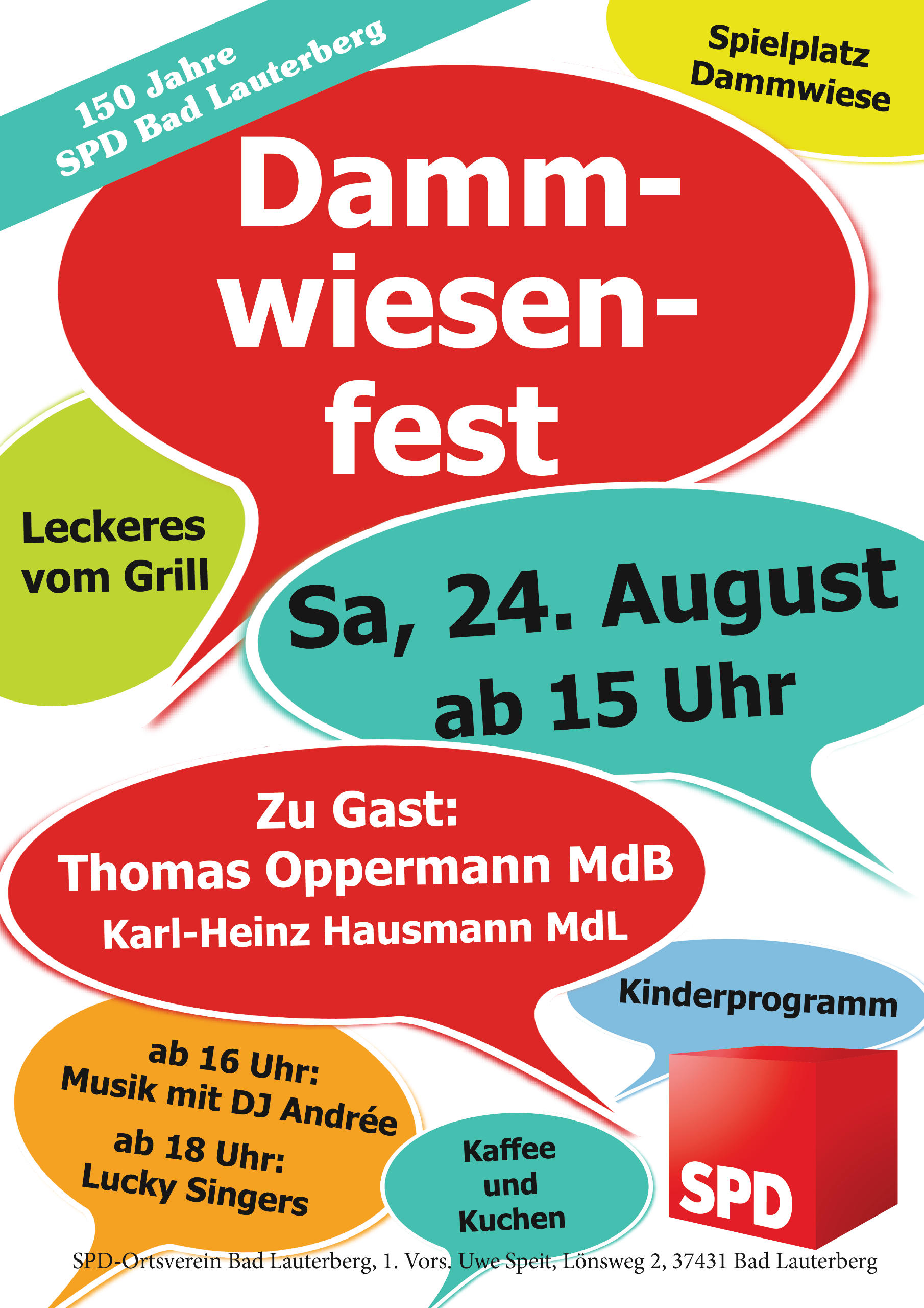 Deshalb gibt es in diesem Jahr Live-Musik von den „Lucky Singers“, die mit ihrem bunten Liederrepertoire schon so manche Veranstaltung unserer Region prägten. Als politische Ehrengäste haben sich der Bundestagsvizepräsident Thomas Oppermann und der Landtagsabgeordnete Karl-Heinz Hausmann angekündigt.